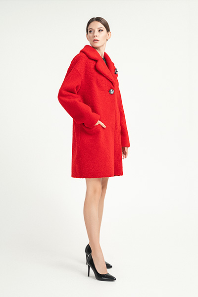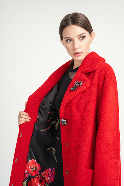 Шуба из керли М-286 с воротником, длина шубы 90 см, цвет красный.