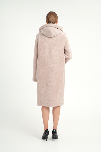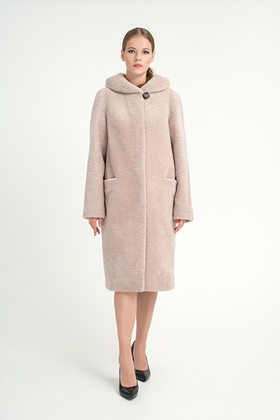 Шуба из керли М-298 с капюшоном, длина шубы 105 см, цвет темно бежевый.
