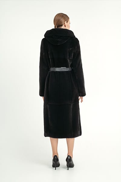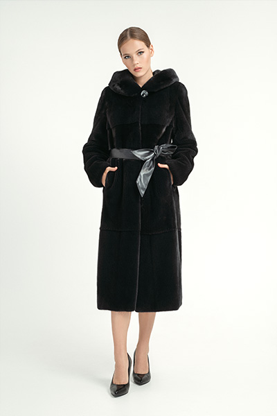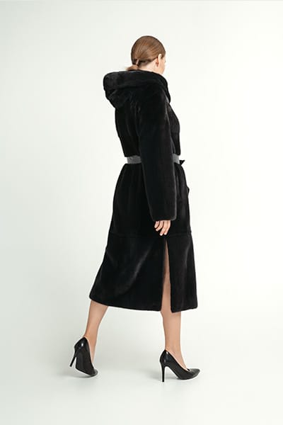 Шуба халат из норки М-534п/92 с капюшоном, длина шубы - 90-120 см, цвет графит.