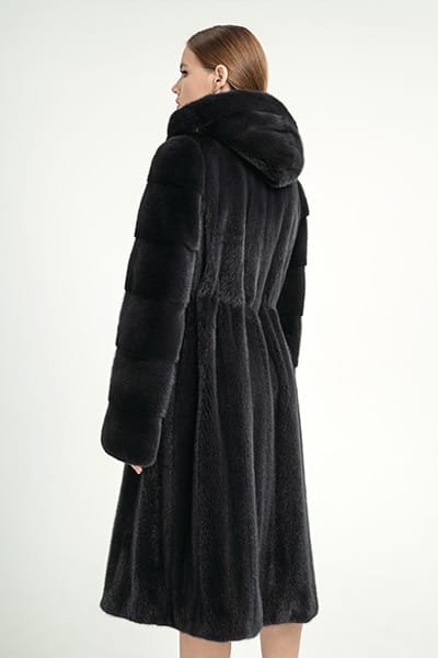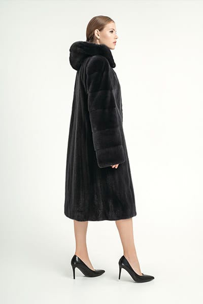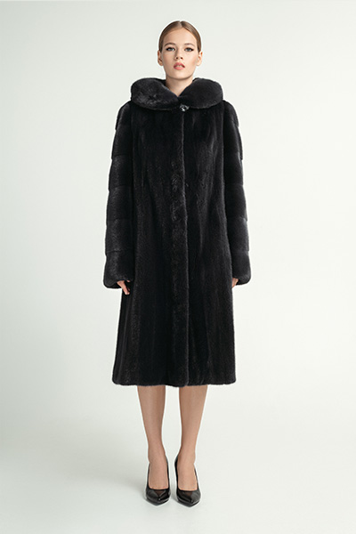 Шуба пошив трапеция из норки М-506р/105 с капюшоном, длина шубы 110 см, цвет мокрый асфальт.