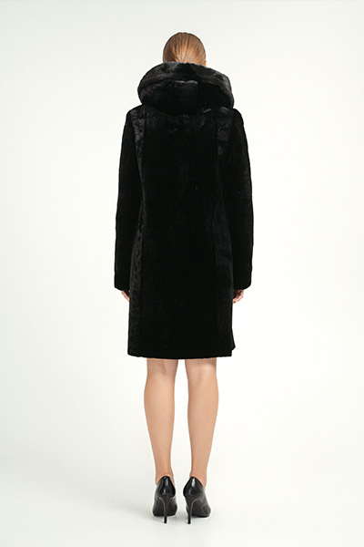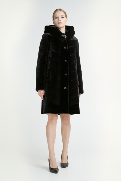 Шубка из мутона М-241с капюшоном, длина шубы 95 см, отделка из норки, цвет черный.