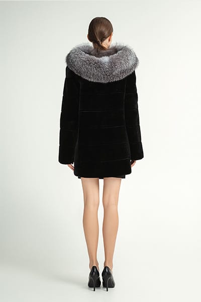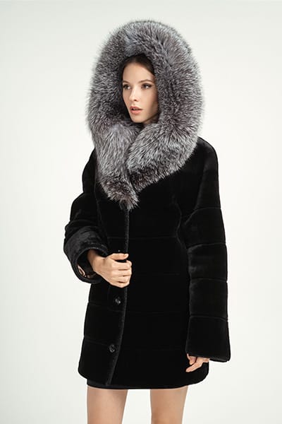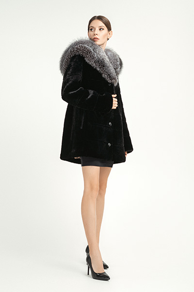 Шубка из мутона М-273 с капюшоном, длина шубы 80 см, отделка блюфрост, цвет черный.